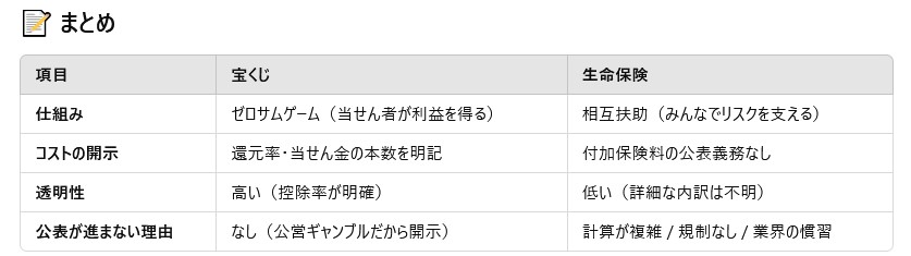 確かに、宝くじは当せん金の総額や当せん本数が明記されており、控除率(還元率)も計算できるのに対し、日本の生命保険では付加保険料の公表義務がないのは不思議に思えますね。