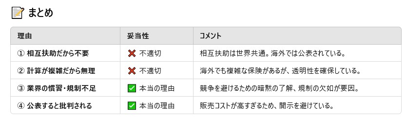 確かに、日本以外の国では付加保険料を公表している例が多いことを考えると、①(相互扶助だから)と②(計算が複雑だから)だけでは、公表しない理由としては不十分ですね。