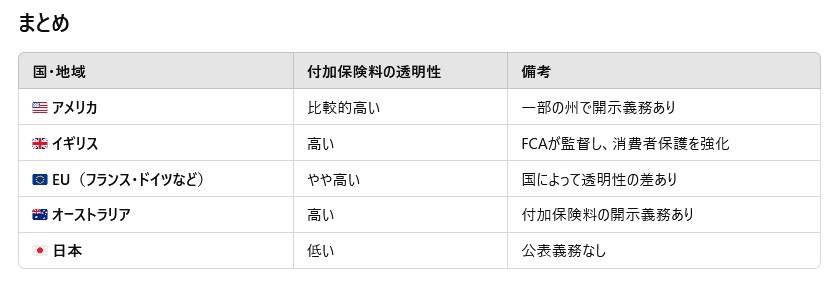 アメリカやイギリスでは、政府機関(FCA、NAICなど)が透明性を求めているが、日本では金融庁が付加保険料の開示を義務化していない。